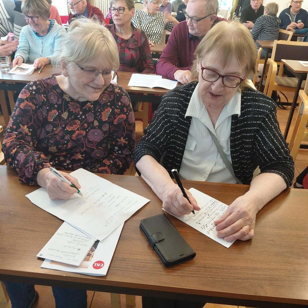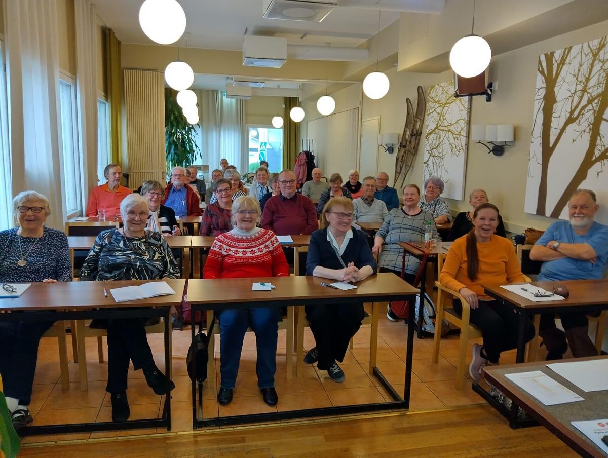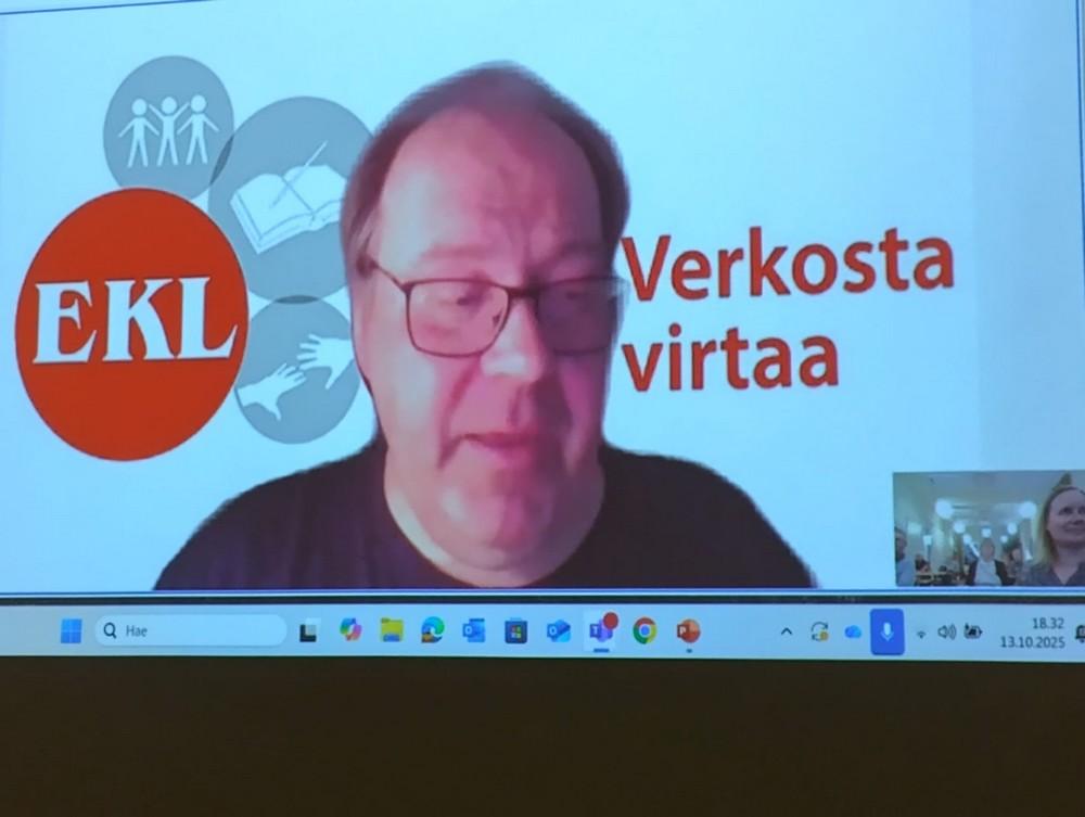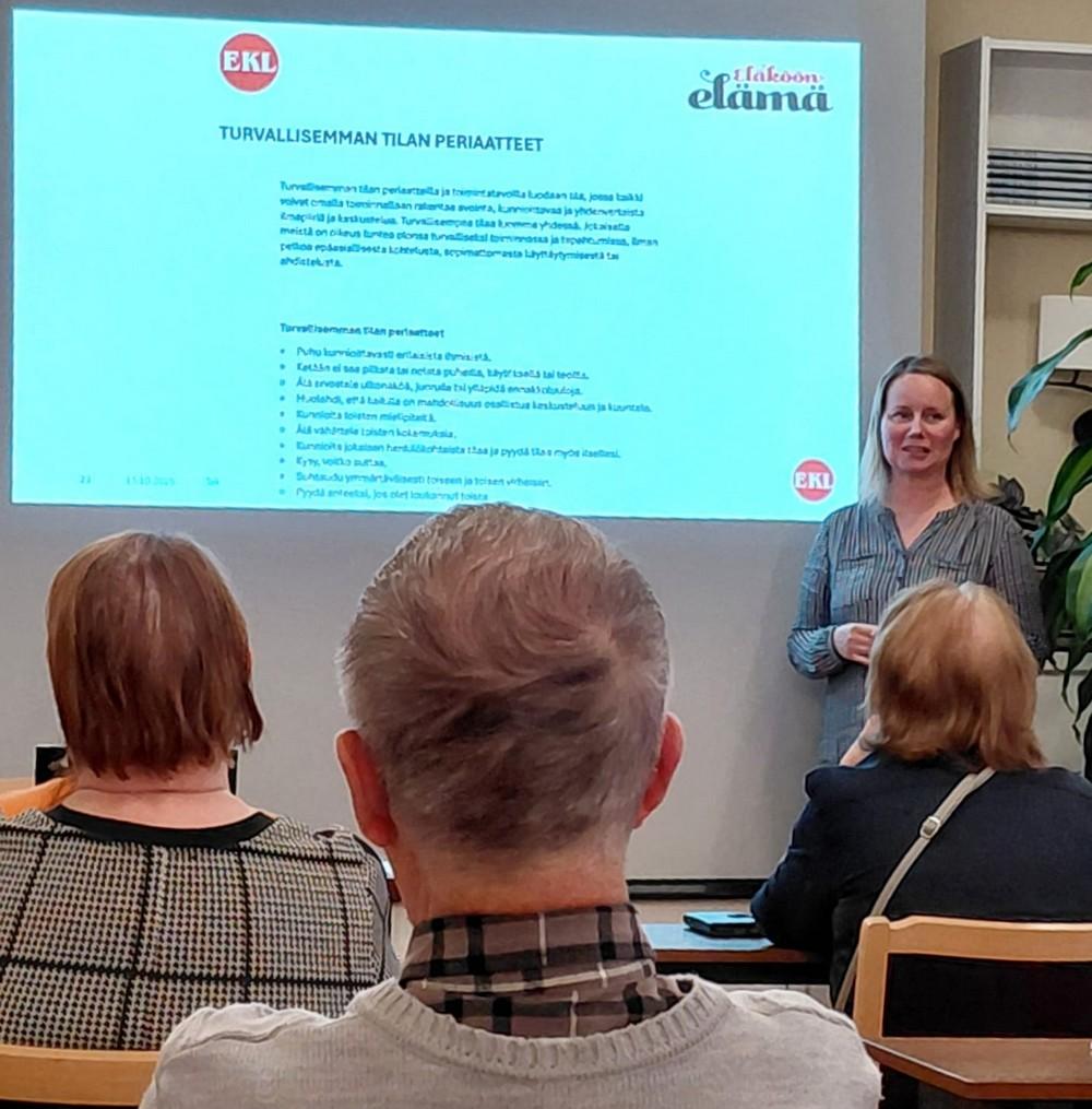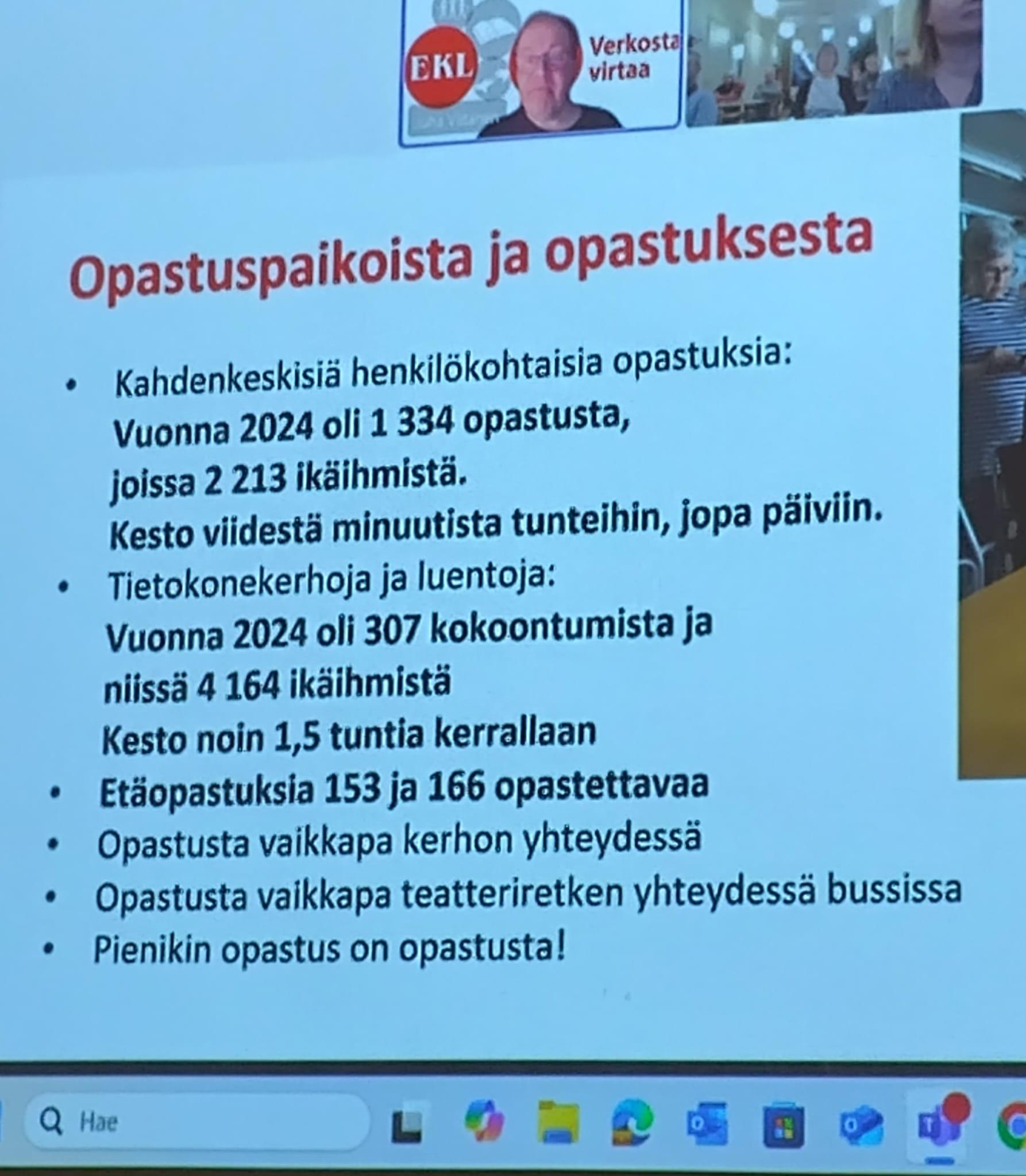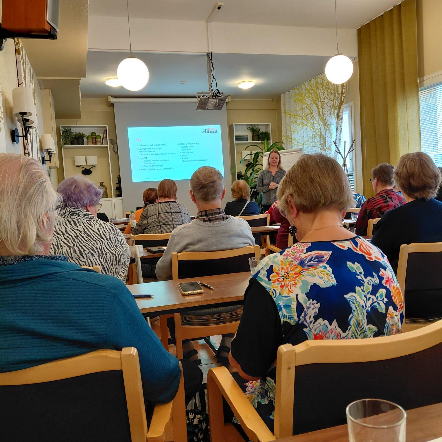 Ensimmäisen päivän ohjelmassa oli Liiton ajankohtaiset asiat ja yhdistysten saamat tuet, joita Inari kehotti rohkeasti hakemaan, vaikka hakuprosessi vaatiikiin vaivannäköä ja tarkkaa raportointia. Hän muistutti myös hyvinvointialueilta saatavasta tuesta järjestöille. Jotkut yhdistykset olivat tätä tukea anoneet ja saaneet. Toisena aiheena oli ”Yhdistyksen vuosi EKL:ssä”, tässä osiossa täytetiin harjoitelmana yhdistyksen vuosikello, joka selkeyttää ja muistuttaa tärkeistä tehtävistä ja päivämääristä tiettyjen asioiden hoitamisessa. Huomattiin ihan konkreettisesti, kuinka paljon yhdistyksen toimihenkilöiden vastuulla on hoidettavia asioita, jotka eivät välttämättä näy rivijäsenelle ollenkaan.
