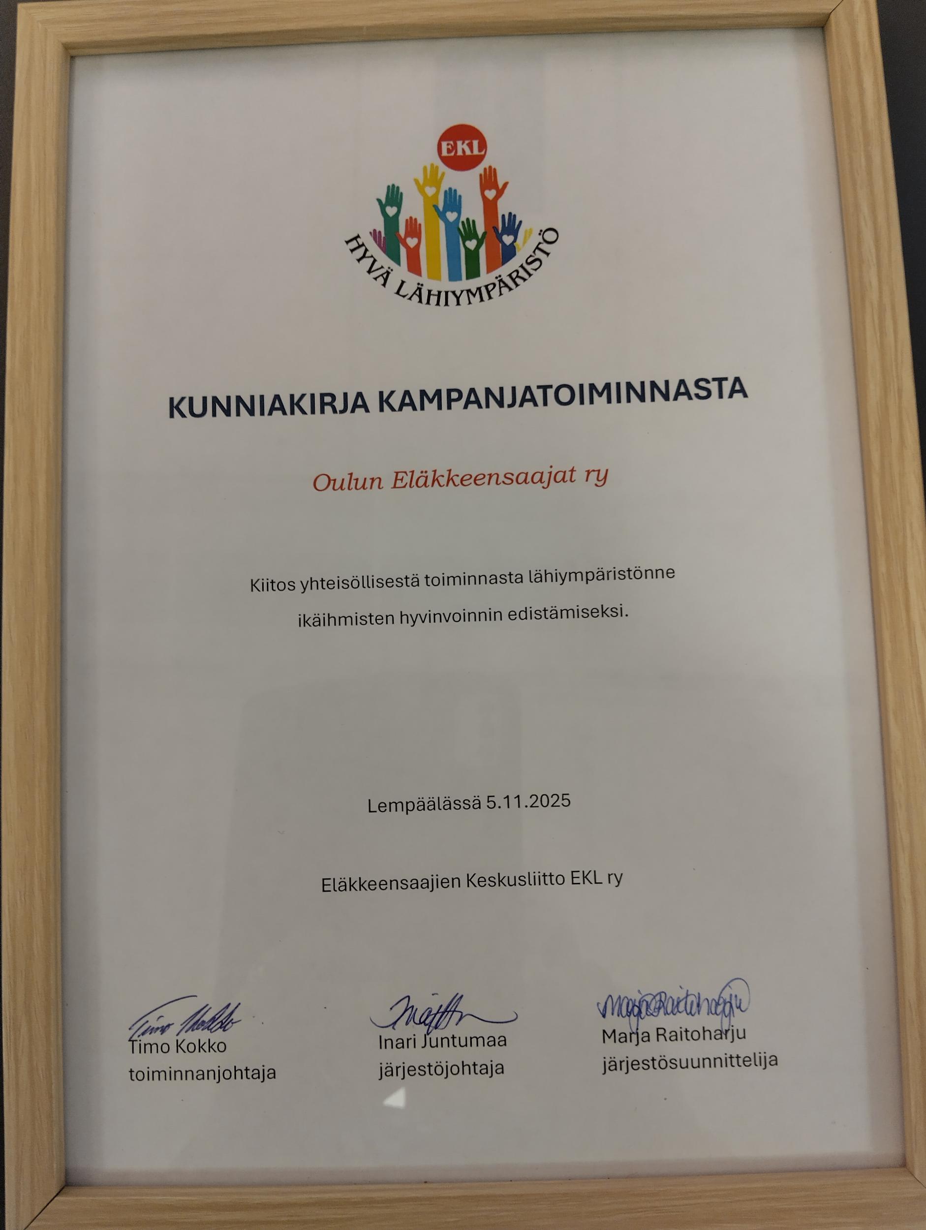 Oulun eläkkeensaajat osallistui syys-lokakuussa 2025 EKL:n valtakunnalliseen kampanjaan ”Hyvä lähiympäristö. Yhdistyksen kampanjaohjelmassa oli Pyhiinvaellus Oulun Pikisaaressa, opastettu kävely Ainolan Puistossa, vierailuja Ikäihmisten Olohuoneissa ja Palvelutaloissa. Vierailujen ohjelmaan kuului boccian peluuta, tuolijumppaa, yhteislaulua ja musiikki- ja runoesityksiä. Näkyvin tapahtuma Kauppakeskus Valkeassa 1.10.2025, missä mukana oli Laulakko Nää kuoro Suvin johdolla sekä muita esiintyjiä.