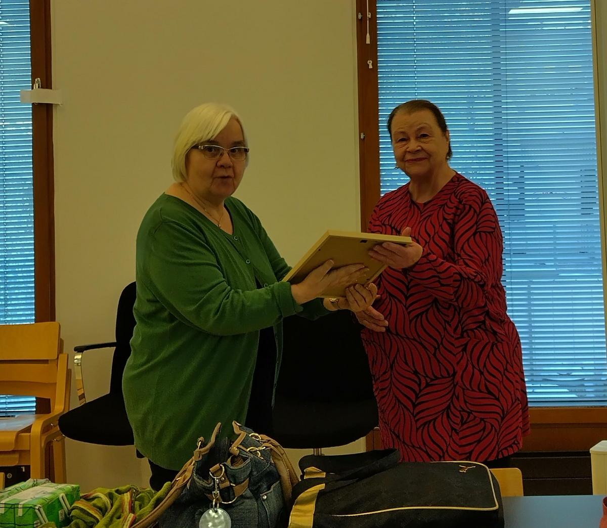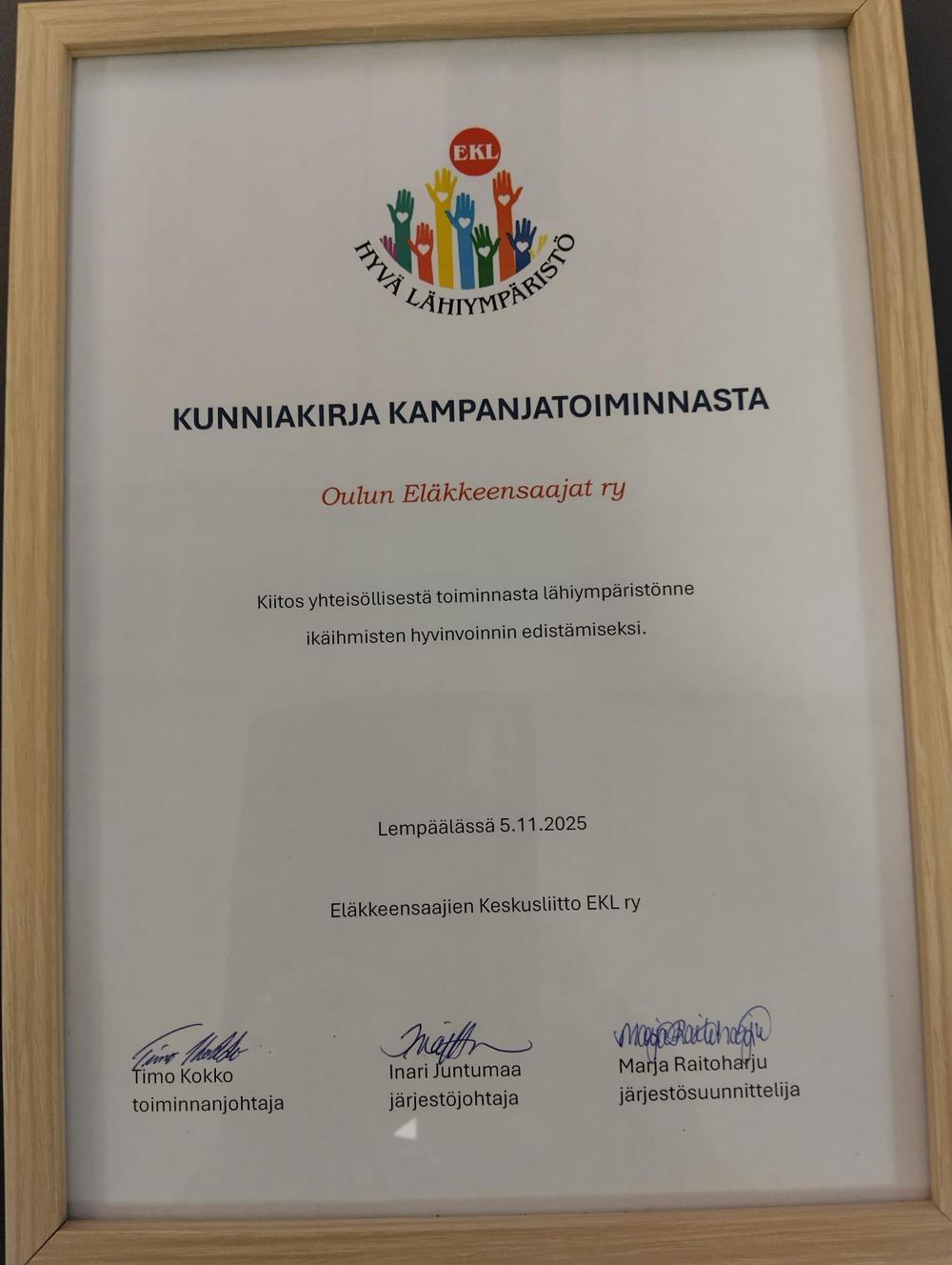 Piirin puheenjohtaja kerttu Mömmö toi Helsingin tulijaisina EKL:n myöntämän ”Kunniakirjan kampanjatoiminnasta”. Kunniakirja luovutettiin Oulun Eläkkeensaajien viime vuoden puheenjohtaja Mervi Hyväriselle piirin työvaliokunnan kokouksessa 4.2.2026.